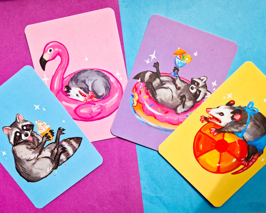 Beach Day Postcards - A6 size - Summer Possum and Beach Raccoon